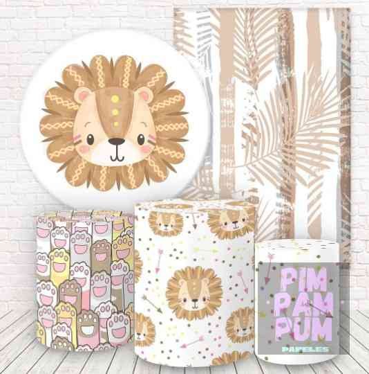 Un diseño encantador con leoncitos, tonos suaves y detalles delicados que crean una ambientación cálida y armoniosa, perfecta para mesa principal, candy bar o sector de fotos. Ideal para cumpleaños infantiles y celebraciones con estética dulce y natural.