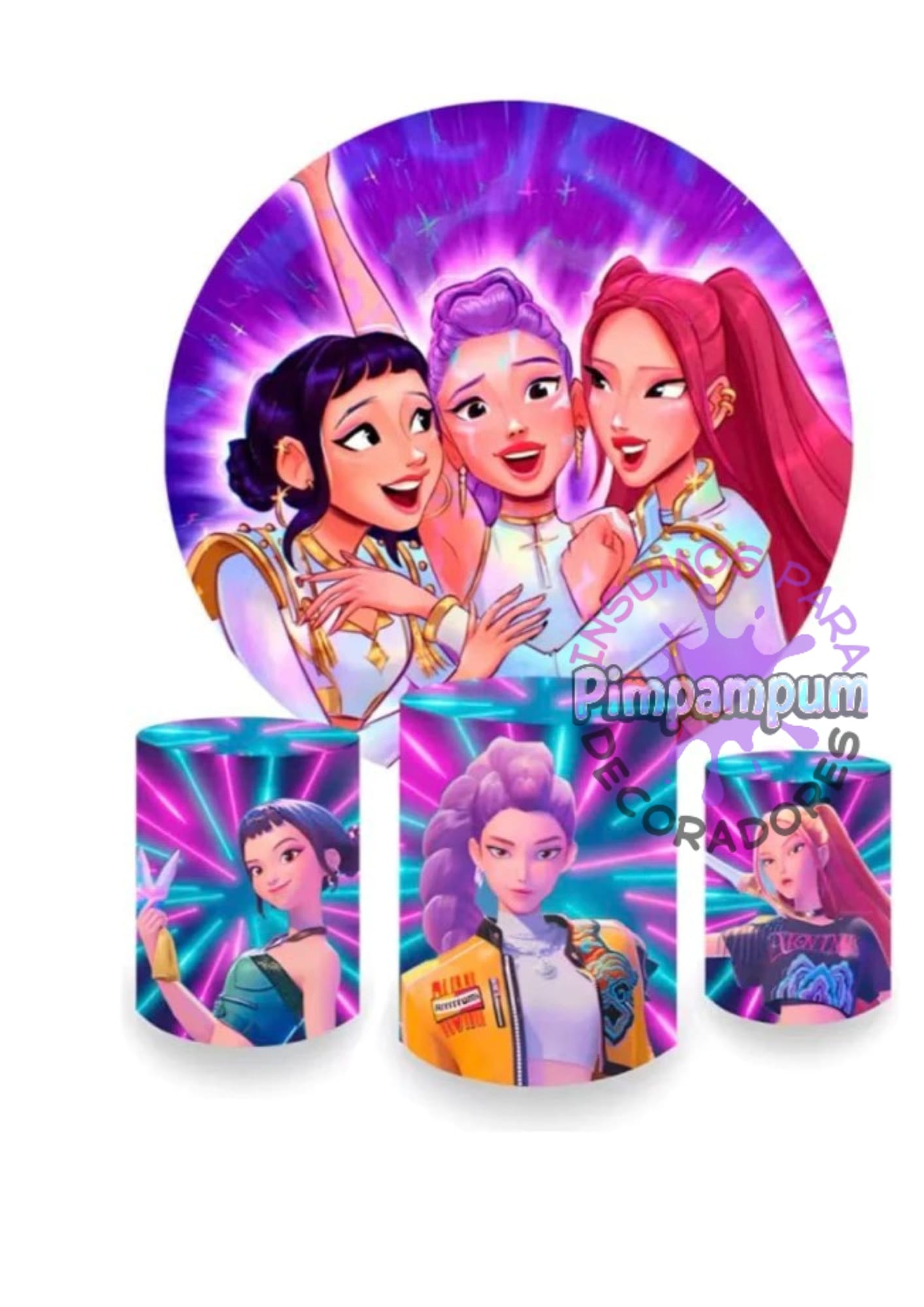 Incluye un panel circular y fundas para mesas en tela sublimada de alta calidad, perfectos para una celebración con toda la energía, glamour y poder femenino de tus ídolas favoritas.